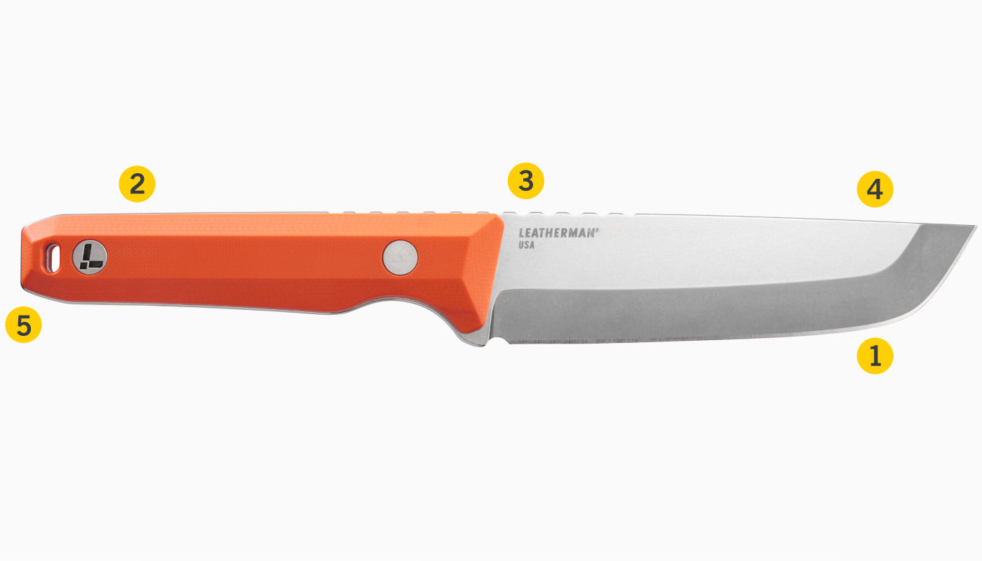 Emplacement du bâtonnet de ferrocérium dissimulé dans la rainureStries pour une meilleure prise en main et inclut une encoche pour frapper un bâton de feu.